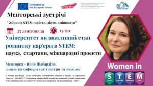 27 листопада 2025 року відбулася третя менторська зустріч у межах програми «Менторські зустрічі «Жінки в STEM: мріяти, діяти, змінювати»» на тему: «Університет як важливий етап розвитку кар’єри в STEM: наука, стартапи, міжнародні проєкти».